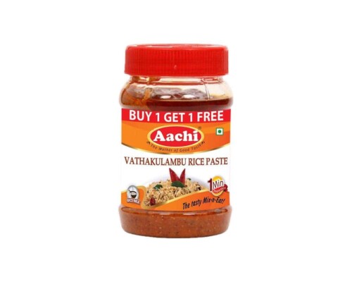 ఆచి న్యూ వత్తకుళంబు పేస్ట్ 200 గ్రాముల ప్యాక్ (బై 1 గెట్ 1 – వేరే ఫ్లేవర్తో). ఇది దక్షిణ భారతీయ వత్తకుళంబు లేదా కులంబు వంటకానికి సిద్ధంగా వాడే తయారైన పేస్ట్ – రుచికరమైన మరియు ఘాటుగా ఉంటుంది.