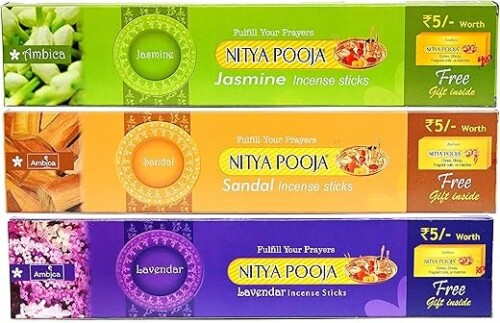 అంబిక నిత్య పూజా అగరబత్తీలు – 85గ్రా. సాండల్, లావెండర్, జాస్మిన్ సువాసనల మల్టీ ప్యాక్. సహజంగా మరియు చేతితో తయారైన ఈ అగరబత్తీలు పూజా సందర్భాల్లో శుభతను, శాంతిని కలిగిస్తాయి.