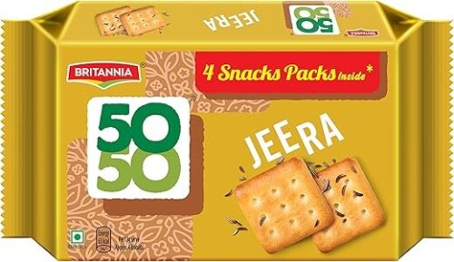 జీలకర్ర సువాసనతో నిండి ఉన్న బ్రిటానియా 50-50 జీరా మస్తీ బిస్కెట్లు – తేలికపాటి ఉప్పు రుచి మరియు స్పైసీ ఫ్లేవర్‌తో ఏ సమయంలోనైనా తినదగిన హెల్తీ స్నాక్. 260g లేదా 300g ప్యాక్‌లో లభ్యం.