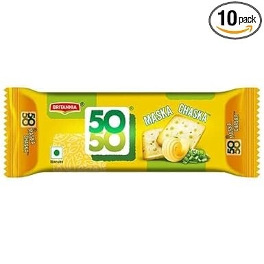 Britannia 50-50 Maska Chaska Biscuit, 45.5g Each (Pack of 10) – 100% Veg – Yellow Pack
