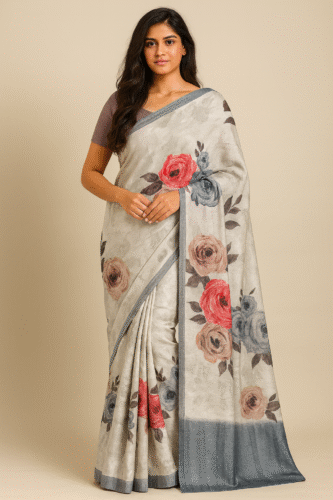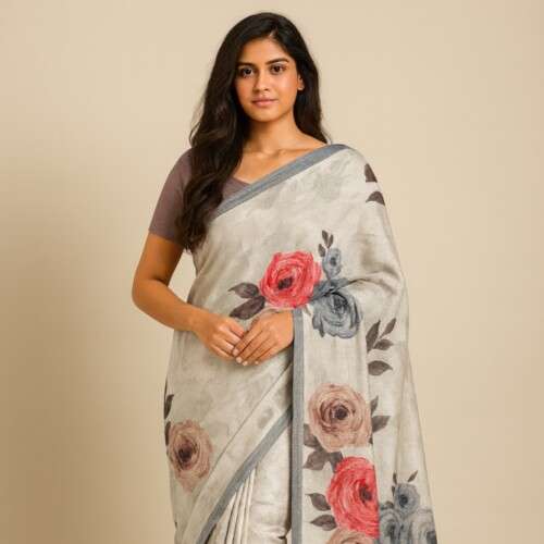This Elegant Soft Linen Floral Printed Saree blends sophistication with subtle charm. The soothing grey base is enhanced with beautiful floral rose prints in red, peach, and grey tones, giving the saree a refreshing and graceful appearance.
