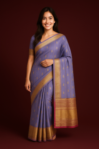 The saree is paired with a matching lavender blouse featuring zari sleeve detailing, completing its poised and sophisticated look. The light yet lustrous silk fabric drapes beautifully, making it ideal for weddings, festive gatherings, and formal occasions.