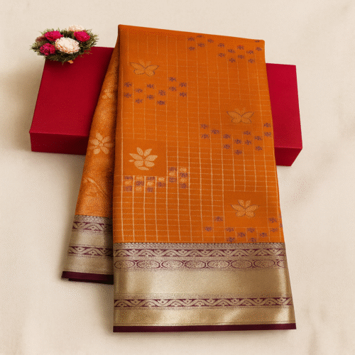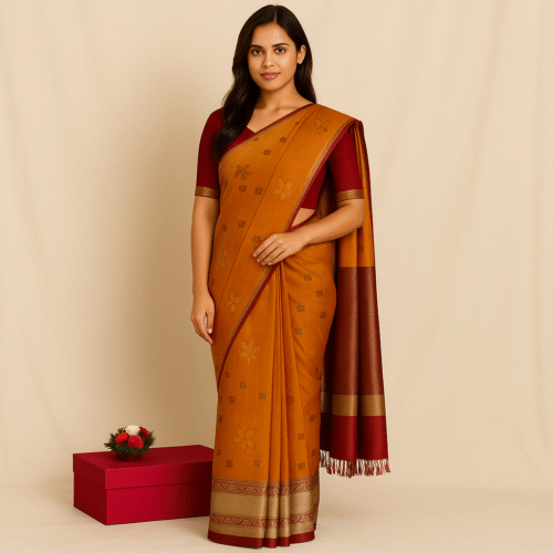 The saree is enhanced with a maroon and gold zari border, adding richness and traditional charm. The pallu features fine zari detailing, lending a festive and luxurious touch. Crafted from a smooth, lightweight silk-blend fabric, it drapes beautifully and provides excellent comfort, making it ideal for weddings, festivals, temple visits, and family gatherings.