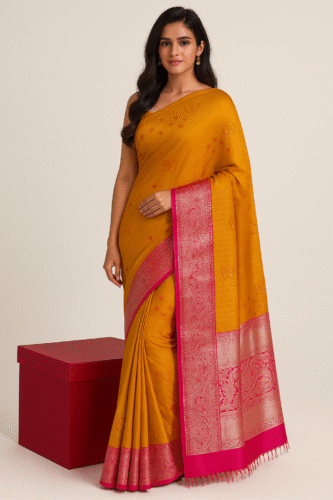 This stunning mustard-yellow saree is beautifully crafted with delicate woven butterfly and floral motifs that add a touch of charm to its elegant design. The saree features a rich contrasting pink zari border and pallu, showcasing intricate traditional patterns that enhance its festive appeal.