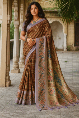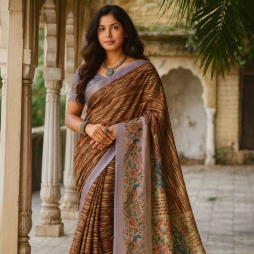 This Premium Linen Blend Floral Saree is a refined combination of earthy tones and artistic detailing. The saree features a beautiful brown textured body with multi-shade woven effect, giving it a luxurious and sophisticated appeal. The contrasting lavender border showcases intricate digital floral and bird motifs, adding a touch of traditional charm to its modern silhouette.