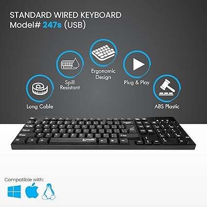 The keyboard supports plug-and-play connectivity, requiring no additional drivers — simply connect via USB and start typing instantly. Its durable build and UV-coated keys prevent fading, ensuring long-lasting performance. Perfect for offices, schools, and home PCs, the ProDot KB-207s is compatible with Windows, macOS, and Linux operating systems.