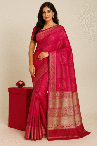 This elegant Rani Pink Banarasi Silk Saree showcases timeless craftsmanship with its beautifully woven gold zari motifs arranged across the saree. The rich color combined with detailed zari designs makes it a standout choice for festive and traditional occasions.