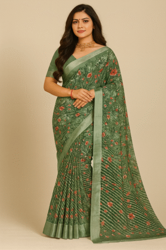 Made from a premium linen blend fabric, the saree feels soft, breathable, and lightweight—ideal for long hours of wear during office, casual outings, festive events, or family gatherings. The saree features a neatly coordinated solid green border, adding refinement to the overall design.