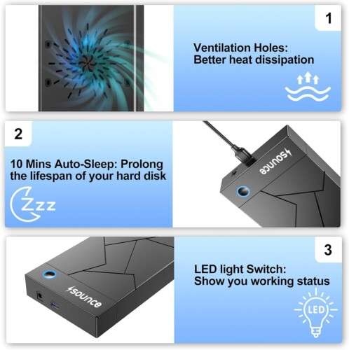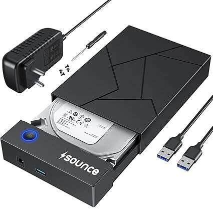 Sounce 3.5-inch SATA to USB 3.0 external hard drive enclosure with power adapter, designed for easy data transfer and secure storage. Compatible with both 2.5” and 3.5” SATA HDD/SSD drives, offering fast transfer speeds up to 5Gbps.