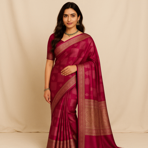 This beautiful Wine Pink Banarasi Silk Saree brings together elegance and tradition with its refined geometric woven body pattern and soft, luxurious texture. The deep wine-pink shade exudes richness, making it an ideal choice for both day and evening events.