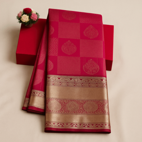 The saree is complemented by an antique gold zari border and pallu, showcasing intricate craftsmanship inspired by classic Banarasi artistry. Made from a premium silk-blend fabric, it drapes smoothly, offering comfort and a regal finish suitable for weddings, festive functions, temple ceremonies, and cultural events.