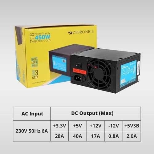 The Zebronics ZEB-450W Black Gold Power Supply delivers efficient, stable, and safe power for your desktop computer. Designed to meet everyday computing needs, it provides 450 watts of continuous power output, making it ideal for office systems, home PCs, and entry-level gaming rigs.